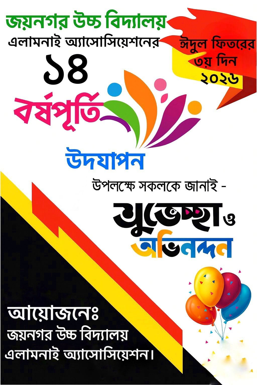 আসন্ন পবিত্র ঈদুল ফিতরের ৩য় দিন ২০২৬ তারিখে আমাদের প্রিয় জয়নগর উচ্চ বিদ্যালয় এলামনাই অ্যাসোসিয়েশন এর ১৪ বছর পূর্তি ও প্রাক্তন এবং বর্তমান শিক্ষার্থীদের মিলন মেলা-২০২৬, উপলক্ষে এক বর্ণিল ও স্মরণীয় উদ্যাপনের আয়োজন করা হয়েছে।